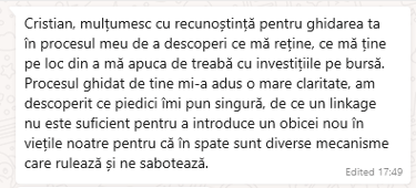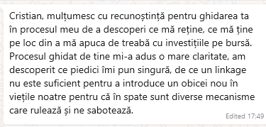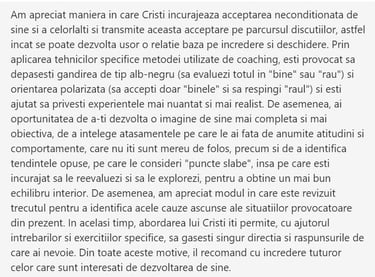 Pasionat de înțelegerea comportamentului uman și încurajat de feedback-ul primit de-a lungul timpului pentru abilitățile de a recunoaște tipare, a identifica rapid cauzele problemelor și a găsi soluții inovative, precum și pentru disponibilitatea de a asculta și a oferi ajutor, am dedicat timp pentru pregătire în coaching, astfel că am participat la Emotional Loyalties System (Program de 6 luni de Coaching cu Psihologia Legilor Universale și Teoria Fidelității și a Măștilor).