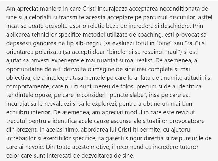 Pasionat de înțelegerea comportamentului uman și încurajat de feedback-ul primit de-a lungul timpului pentru abilitățile de a recunoaște tipare, a identifica rapid cauzele problemelor și a găsi soluții inovative, precum și pentru disponibilitatea de a asculta și a oferi ajutor, am dedicat timp pentru pregătire în coaching. Pe lângă mult studiu individual, am participat la Emotional Loyalties System (Program de 6 luni de Coaching cu Psihologia Legilor Universale și Teoria Fidelității și a Măștilor).